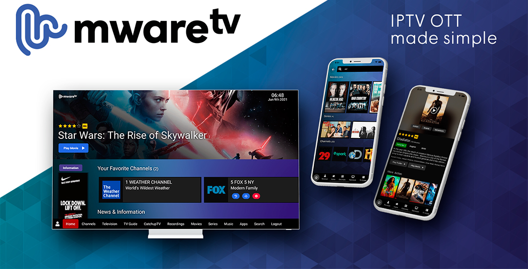 MwareTV proporciona una plataforma de entrega de contenido alojada en la nube para servicios OTT e IPTV. El servicio incluye todas las funciones requeridas, desde la adquisición y entrega de contenido hasta el soporte para aplicaciones de Apple y Android, FireTV, Roku y Samsung y LG Smart TV. La solución está diseñada para ser completamente escalable y rápida de implementar. Los nuevos proveedores de servicios simplemente pagan a medida que crecen, y se conectan inicialmente sin altos costos iniciales y en tan solo cuatro semanas.