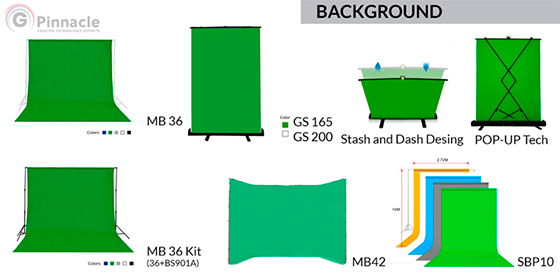 Desde algún Background específicos para diferentes trabajos como EL MB-36 que podes seleccionar en varios colores como Negro/blanco/azul/verde/gris, de 3* 6m de color solido o el Kit MB36 con BS901A (Kit de soporte de fondo ajustable) o los tan apreciados fondos de stash and dash design, que con un solo movimiento desaparece de escena, estos son super practicos si dispones de poco espacio y preferis que el fondo no quede a simple vista.