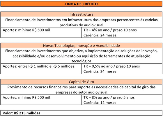 ANCINE también publicó el pasado jueves, 5 de mayo, una resolución del Comité de Gestión de la FSA que autoriza el inicio de la operación de una nueva línea de crédito en el valor de R$ 215 millones. Con el objetivo de acelerar el crecimiento de la cadena audiovisual brasileña, estimular la generación de empleos, modernizar la infraestructura del sector y apoyar iniciativas orientadas a la innovación y promoción de la accesibilidad, los recursos están disponibles en tres modalidades. Verifique los detalles a continuación:
