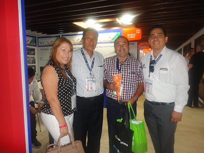| Edgar Carrasco, su esposa y Gonzalo Carrasco de Scientific Satellite de Perú rodean a Mauro Zamora | Erika Tapia y Konrad Burchard de TuVes HD rodeados por Juan Gonzalo Angel y ejecutivos de GlobalMedia Telecomunicaciones |